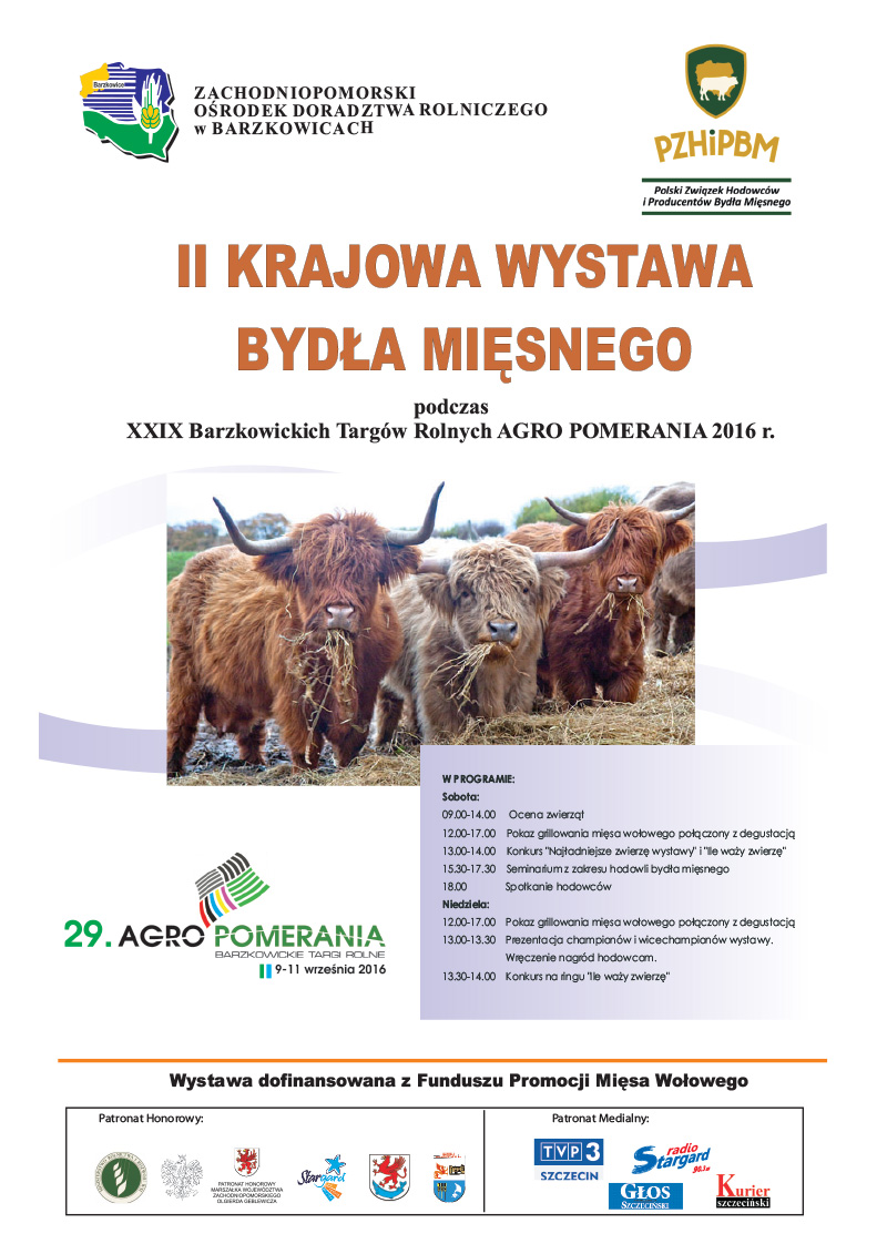 W dniach 10 -11 września 2016 r. na terenie Zachodniopomorskiego Ośrodka Doradztwa Rolniczego w Barzkowicach odbędzie się II Krajowa Wystawa Bydła Mięsnego, na którą już dziś serdecznie Państwa zapraszamy. Planujemy prezentację ok. 100 szt. zwierząt w różnych rasach i kategoriach. Liczymy, że jak poprzednio, będzie to dobry czas spotkań, wymiany doświadczeń oraz wspólnego świętowania naszych Hodowców.