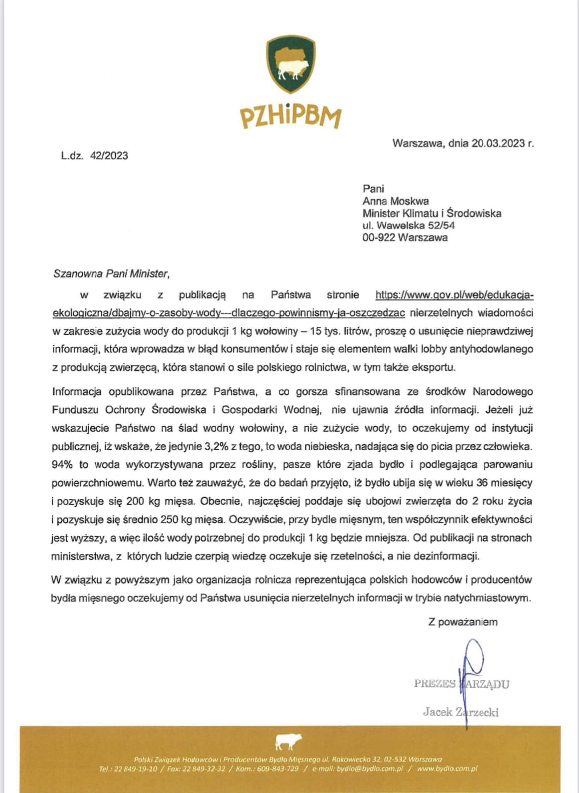 Jacek Zarzecki, prezes Polskiego Związku Hodowców i Producentów Bydła Mięsnego, zwrócił się do Anny Moskwy, Minister Klimatu i Środowiska, w związku z publikacją na stronie ministerstwa „nierzetelnych wiadomości w zakresie zużycia wody do produkcji 1 kg wołowiny – 15 tys. litrów.”