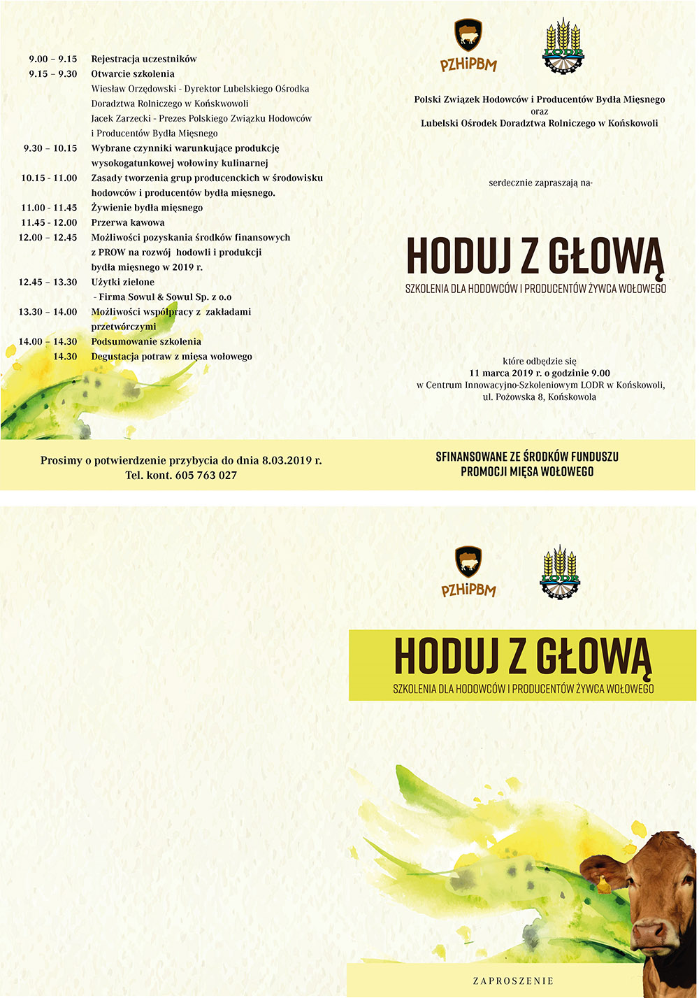 Polski Związek Hodowców i Producentów Bydła Mięsnego oraz Lubelski Związek Hodowców i producentów Bydła Mięsnego zapraszają na szkolenie dla hodowców i producentów mięsa wołowego, które odbędzie się 11 marca 2019 r. w siedzibie Lubelskiego Ośrodka Doradztwa Rolniczego w Końskowoli, ul. Pożowska 8, Centrum Innowacyjno-Szkoleniowe LODR.