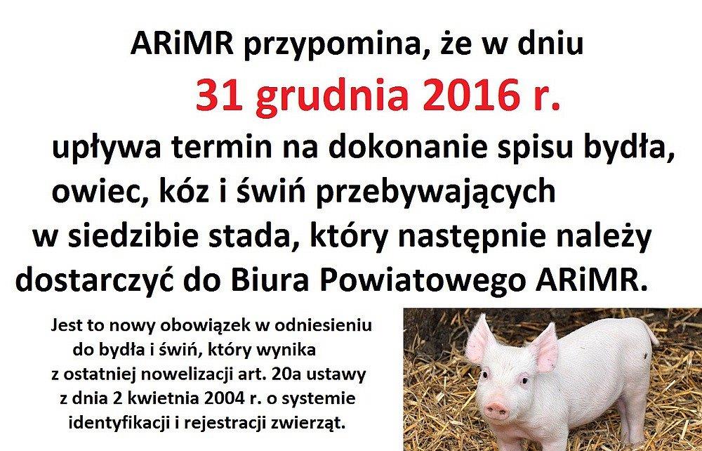 31 grudnia 2016r. upływa termin na dokonanie spisu bydła, owiec, kóz i świń,